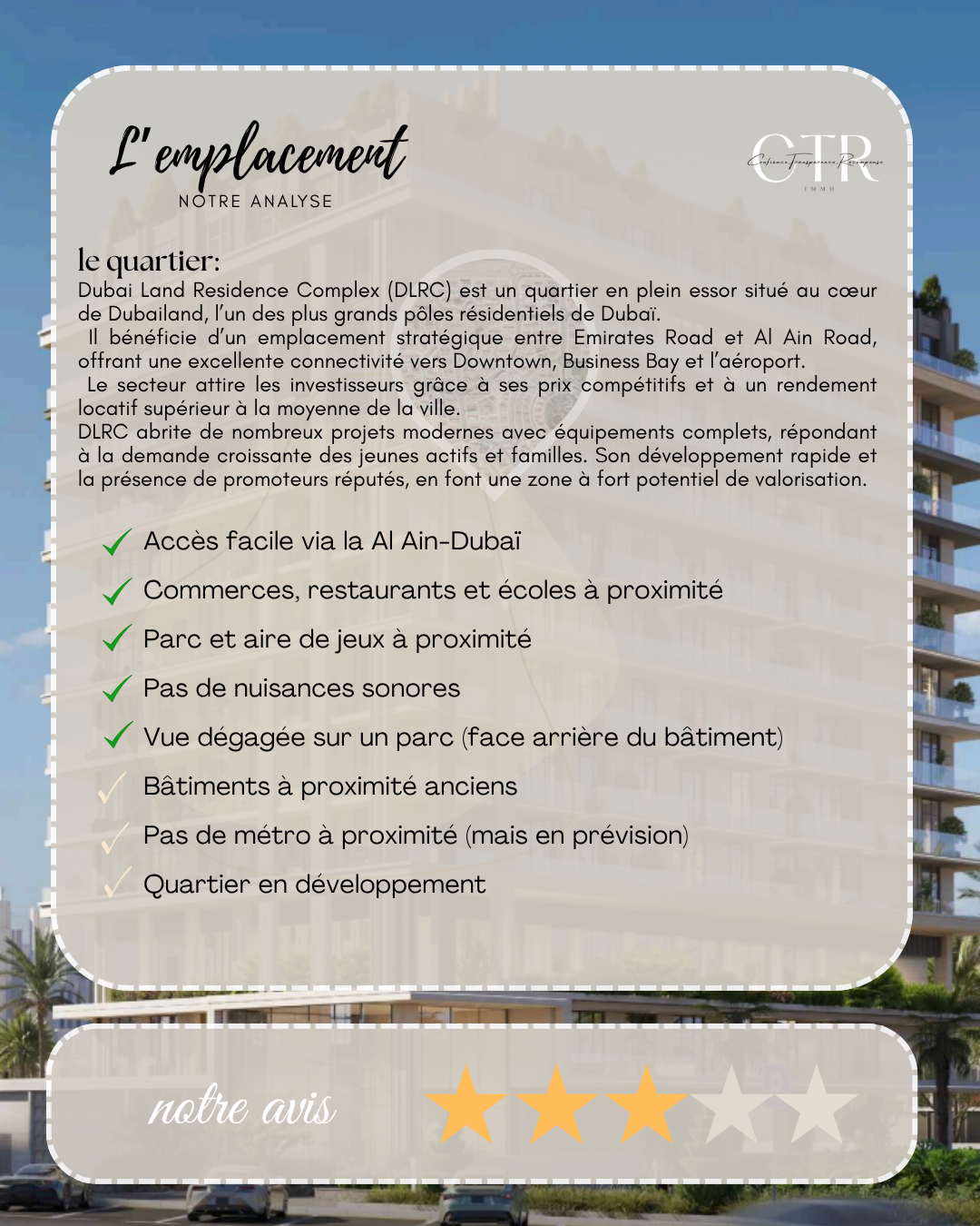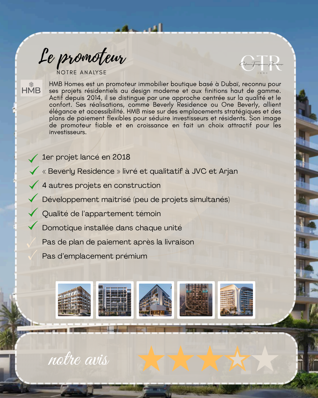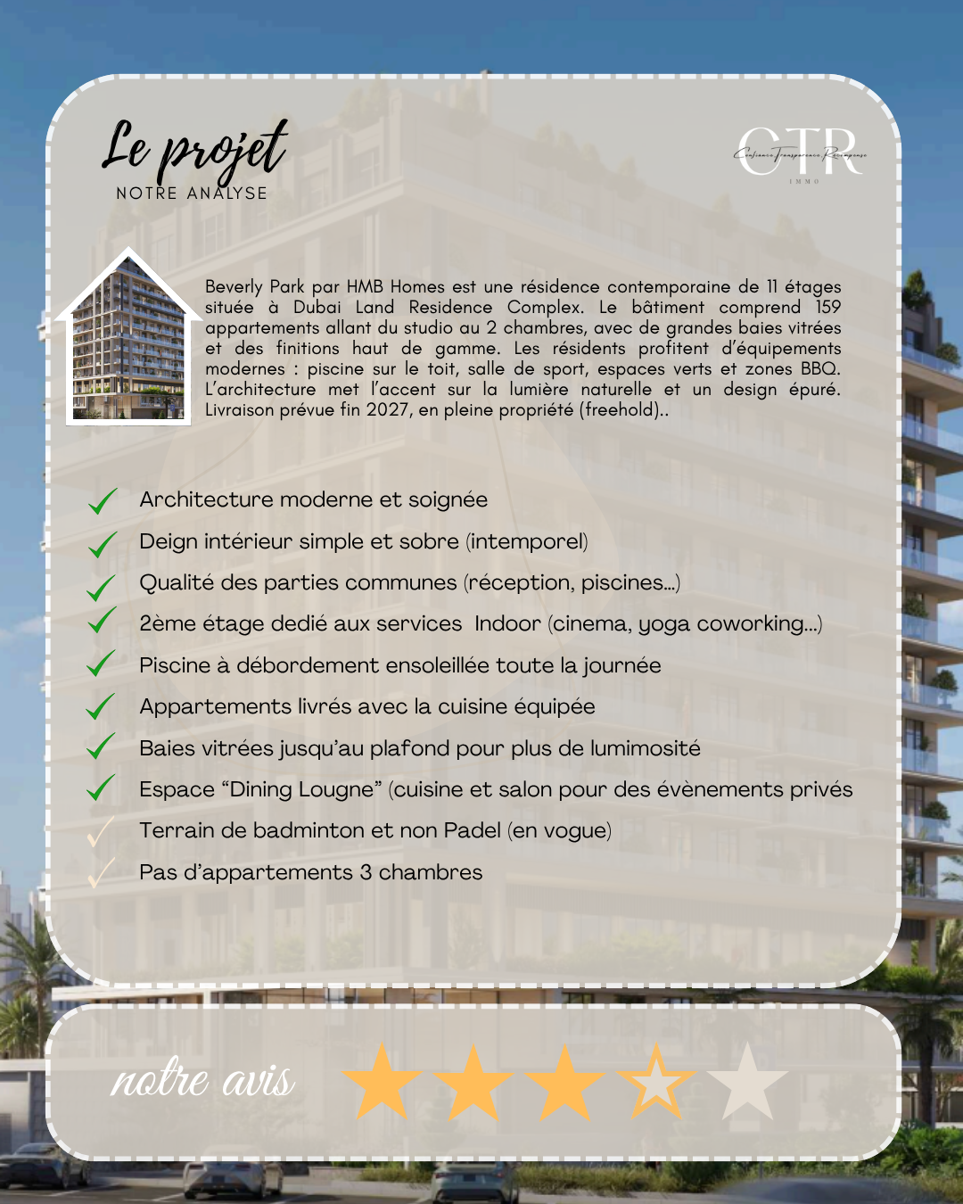 Beverly Park par HMB Homes est une résidence contemporaine de 11 étages située à Dubai Land Residence Complex. Le bâtiment comprend 159 appartements allant du studio au 2 chambres, avec de grandes baies vitrées et des finitions haut de gamme. Les résidents profitent d’équipements modernes : piscine sur le toit, salle de sport, espaces verts et zones BBQ. L’architecture met l’accent sur la lumière naturelle et un design épuré. Livraison prévue fin 2027, en pleine propriété (freehold).