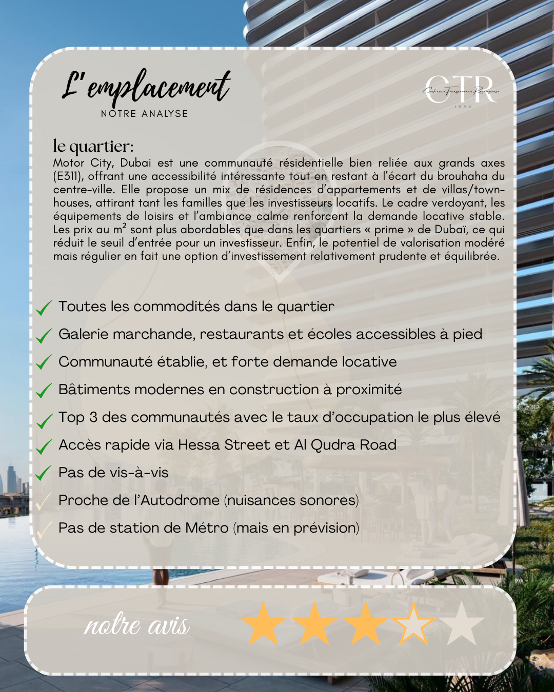 Le projet Binghatti Sky Terraces à Motor City (Dubai) est une tour résidentielle de ~208 m de haut, comprenant environ 1 840 appartements et 26 commerces sur un podium. L’architecture se distingue par ses volumes décalés créant de larges terrasses et des vues dégagées, avec des hauteurs de plancher de ~3,75 m pour valoriser l’espace. Le programme inclut piscine à débordement, rooftop, jardins paysagers et gym, renforçant l’attractivité locative.