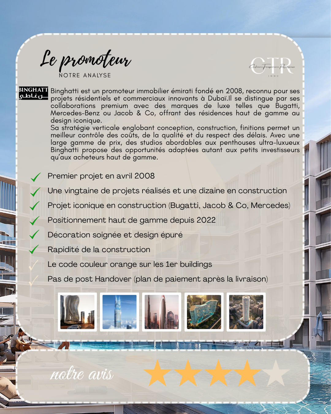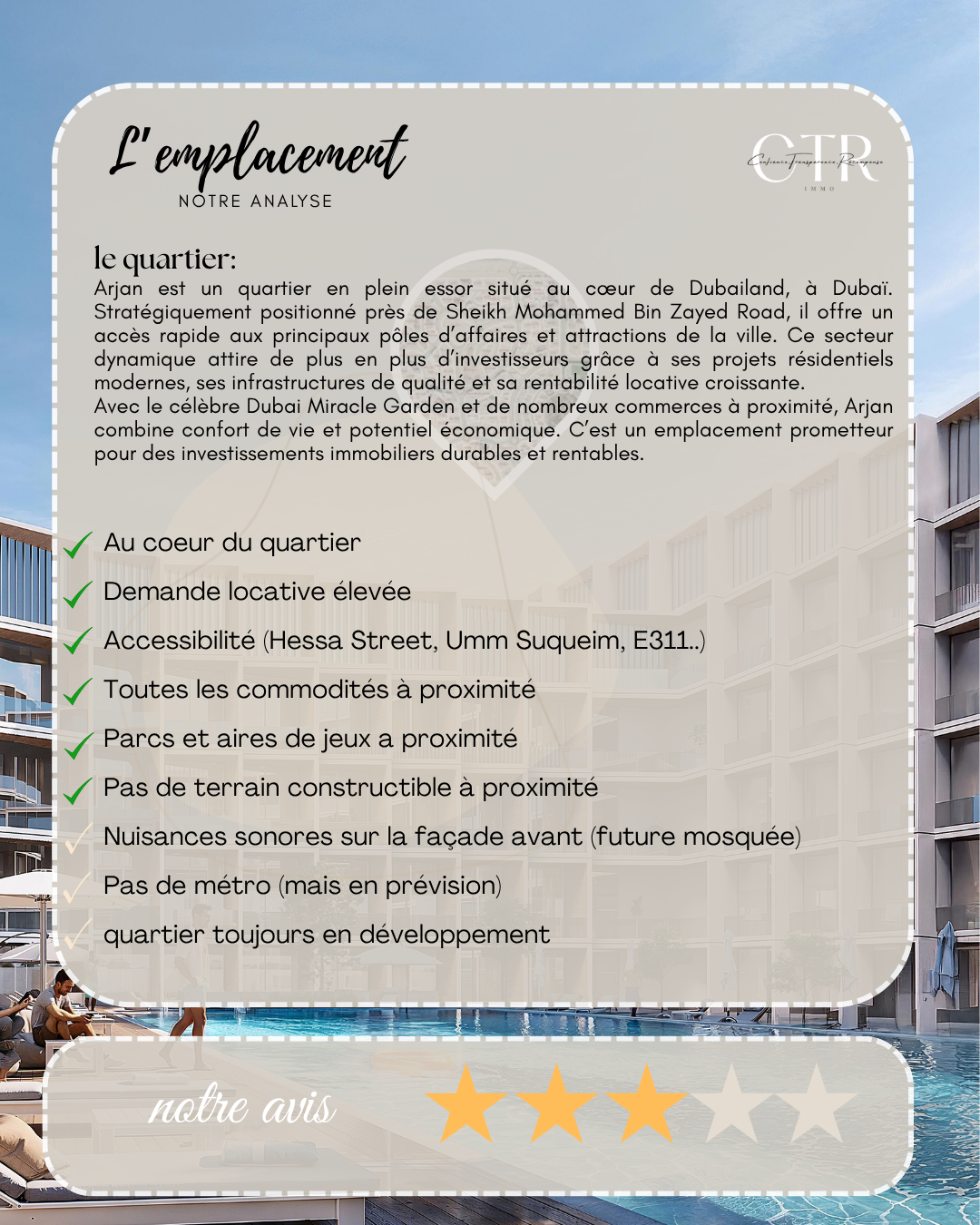 Binghatti Hillcrest is an elegant 4-story residential building with a contemporary design, typical of Binghatti's architectural signature. Its façade blends bold geometric lines with modern finishes, creating a strong visual identity in the Arjan neighborhood. The building houses studios (180), one-bedroom (138), and two-bedroom (4) apartments, designed to maximize natural light and interior comfort. Residents benefit from high-end amenities, a swimming pool, gym, green spaces, and covered parking, all in a secure and refined setting, not to mention the 28 retail outlets on the ground floor.